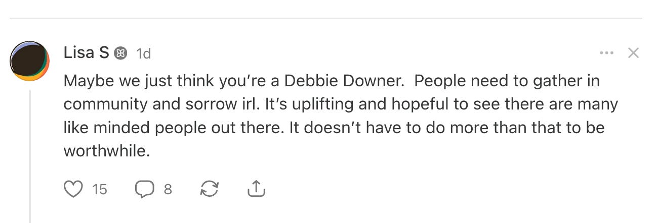 Our spaces are for us. For thinking out loud. For telling the truth without translating it. For laughing, dragging, grieving, remembering, building, venting, and connecting without having to pause every five minutes to explain basic history to y’all. They are for community. For clarity. For relief. Not to be fighting with y’all.