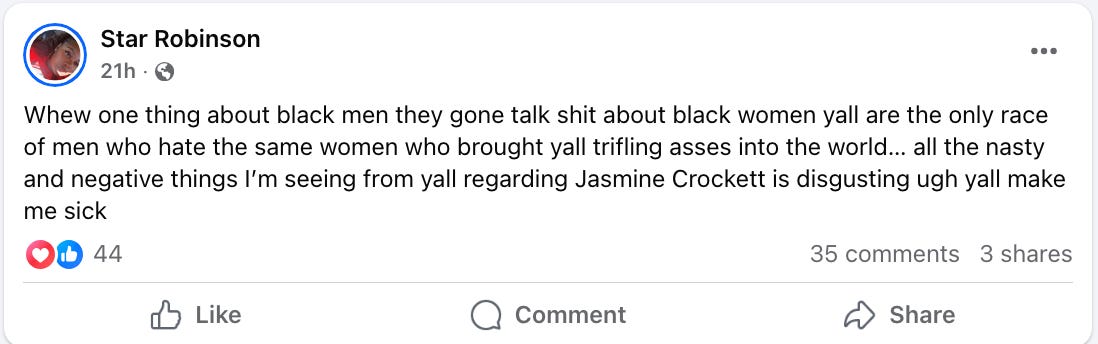 Now let me be clear before we go any further. Misogyny exists. Full stop. The internet is full of ugly shit-talking about Crockett across race lines. White racists stay in her comments calling her the N-word, bitch, and the C-word. I’ve seen Black folks calling her “ghetto” and making comments about her appearance. So anyone pretending that misogyny or racism doesn’t exist in American political culture is living in a fantasy.