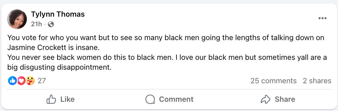 Crockett’s loss was barely digested before folks started declaring that Black men sabotaged her because they hate Black women. It has become such a predictable script that you can practically set a stopwatch to it.