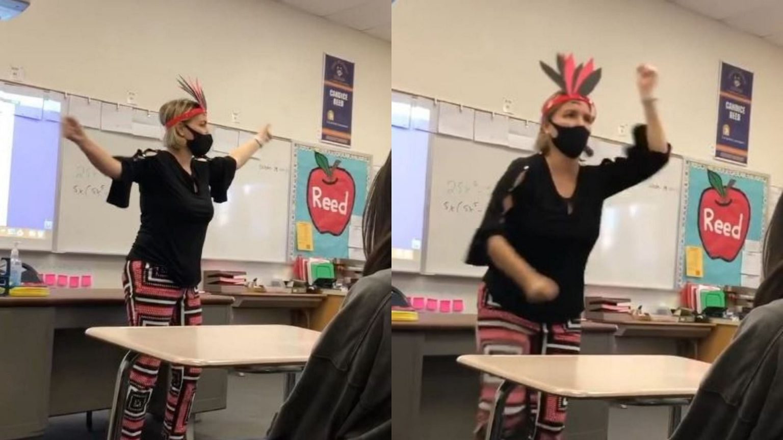 “This was taken at John W. North high school in Riverside, CA. At first the student noticed the teacher was pulling out a fake feather headdress and when she put it on he thought, ‘what is she going to do?'” Johnson wrote in the caption of the Instagram video.