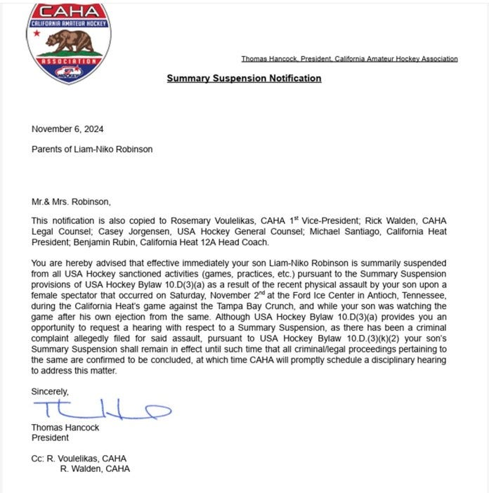 The suspension letter, which is pasted below, states that Liam-Niko is “summarily suspended” by CAHA from all USA Hockey-sanctioned activities.