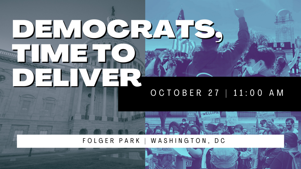 The activists demanded that “four months after passing budget resolution language outlining critical investments in human and physical infrastructure, it is time for Congress to deliver on their promise of: Green jobs and infrastructure, childcare and Medicare expansion, home care and paid leave and a path to citizenship through green cards for immigrants as part of the Build Back Better plan.”