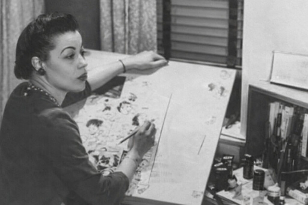 Jackie Ormes (1911–1985) is widely recognized as the first Black woman to become a professional cartoonist in the United States. Self-taught, her work fundamentally reshaped how Black people, especially Black women, were depicted in popular media. Working primarily from the 1930s through the 1950s, she used the comic page to challenge racist caricatures, celebrate Black style and intellect and insert sharp political commentary into everyday Black life.