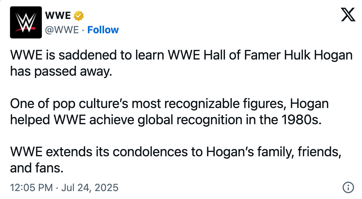 “WWE is saddened to learn WWE Hall of Famer Hulk Hogan has passed away,” wrote WWE in a post on X. “One of pop culture’s most recognizable figures, Hogan helped WWE achieve global recognition in the 1980s. WWE extends its condolences to Hogan’s family, friends, and fans.”