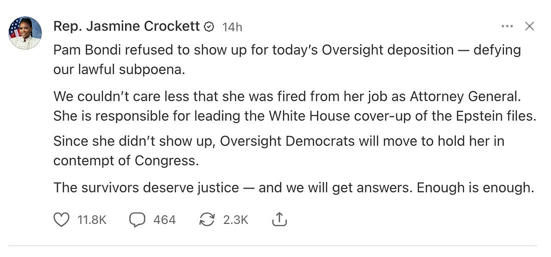 Now you have the recently fired Pam Bondi, who is no longer shielded by the formal constraints of her role, looking at a congressional summons and essentially saying: fuck Congress! And then not showing up yesterday for a deposition as part of the House Oversight and Government Reform Committee’s Jeffrey Epstein probe. And now, the Democrats are fumbling around trying to decide how seriously to take that refusal.