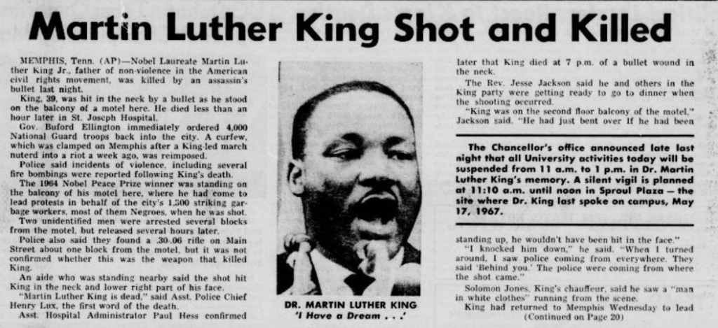 The night before his death, King delivered what would become his final speech. Speaking at Mason Temple, he told supporters that “we’ve got some difficult days ahead,” but said he had “been to the mountaintop” and had seen the future of the movement. Less than 24 hours later, he was dead.