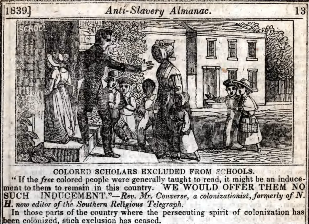 "Colored scholars excluded from schools", an illustration printed by the American Anti-Slavery Society in 1838 (Library Company of Philadelphia)