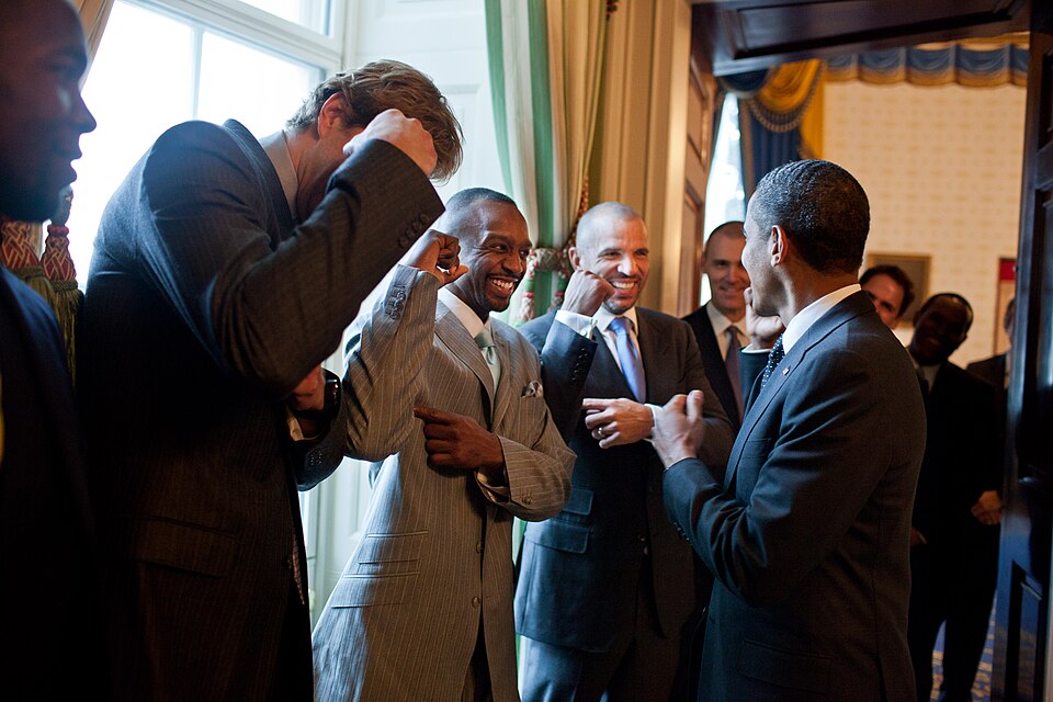 President Barack Obama greets Coach Rick Carlisle, team owner Mark Cuban, and the NBA Champion Dallas Mavericks in the Green Room before honoring the team and their 2011 NBA Championship victory, in the East Room of the White House, Jan. 9, 2012. (Official White House Photo by Pete Souza)