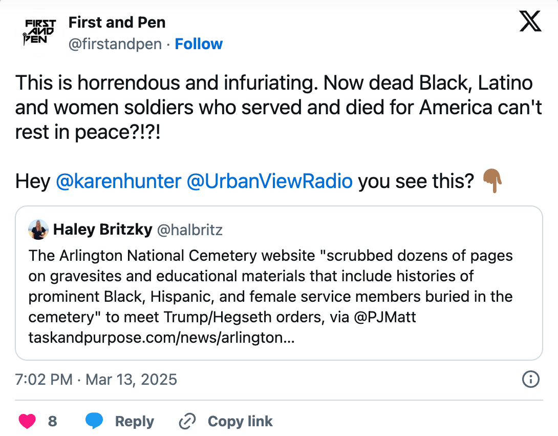 Yet after Arlington Cemetery scrubbed links to information on Black, Latino, and women soldiers from its website due to this administration’s ridiculous anti-DEI decree across federal agencies, these same leagues have gone silent.