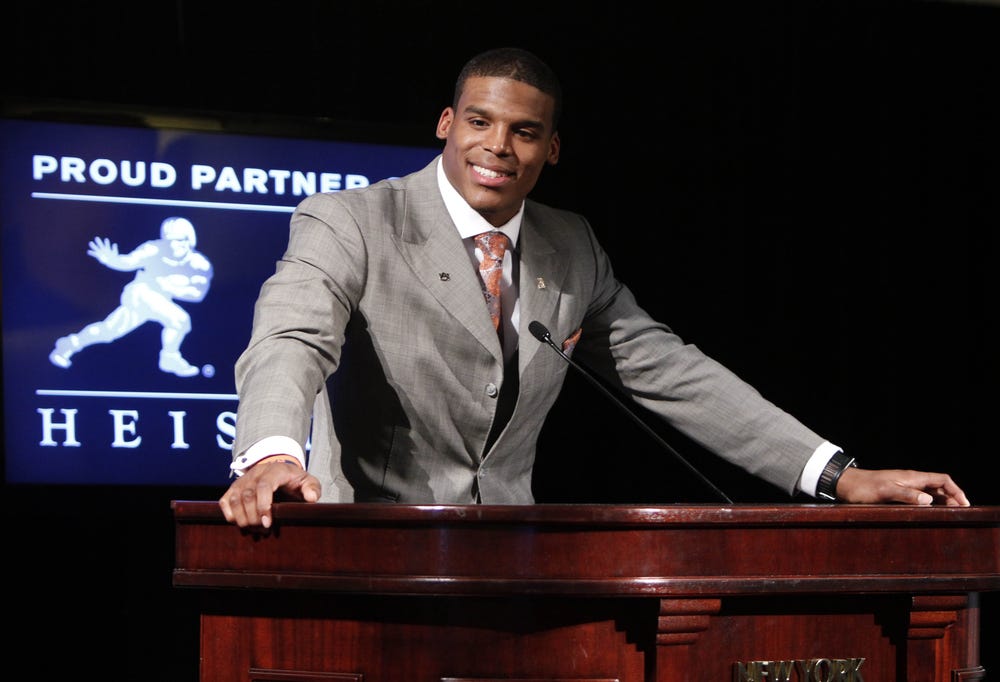 That year, Cam amassed 4,369 total yards (2,854 passing, 1,473 rushing, 42 receiving) and 51 total touchdowns (30 passing, 20 rushing, 1 receiving). That stat line, coupled with the team’s undefeated season, earned him the 2010 Heisman Trophy.