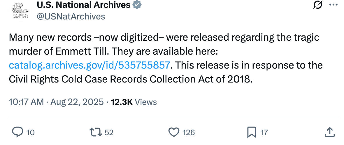“Our thoughts are with the Till family,” said the National Archives in a news release published alongside the records.