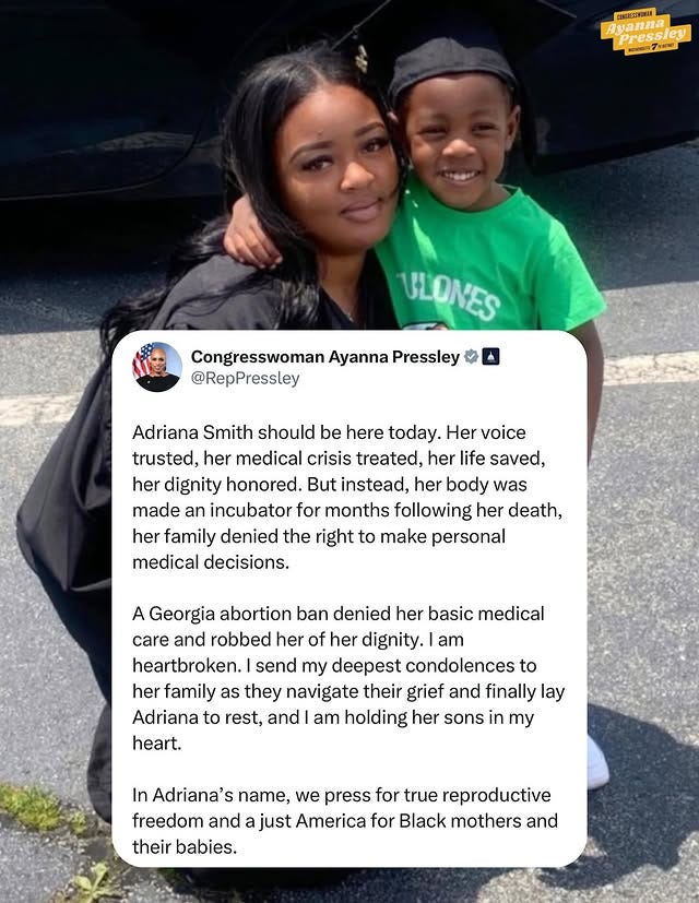 “Women are worth more than their ability to get pregnant and give birth – we are human beings who should be trusted to make our own health care decisions. It’s devastating that Adriana is the latest casualty of our nation’s Black maternal health crisis and anti-abortion laws – but let’s ensure she’s the last,” said Congresswoman Jacobs. “This needs to be the watershed moment to end anti-abortion and fetal personhood laws and guarantee the rights and dignity of everyone to make the best health care decisions for themselves and their families.”