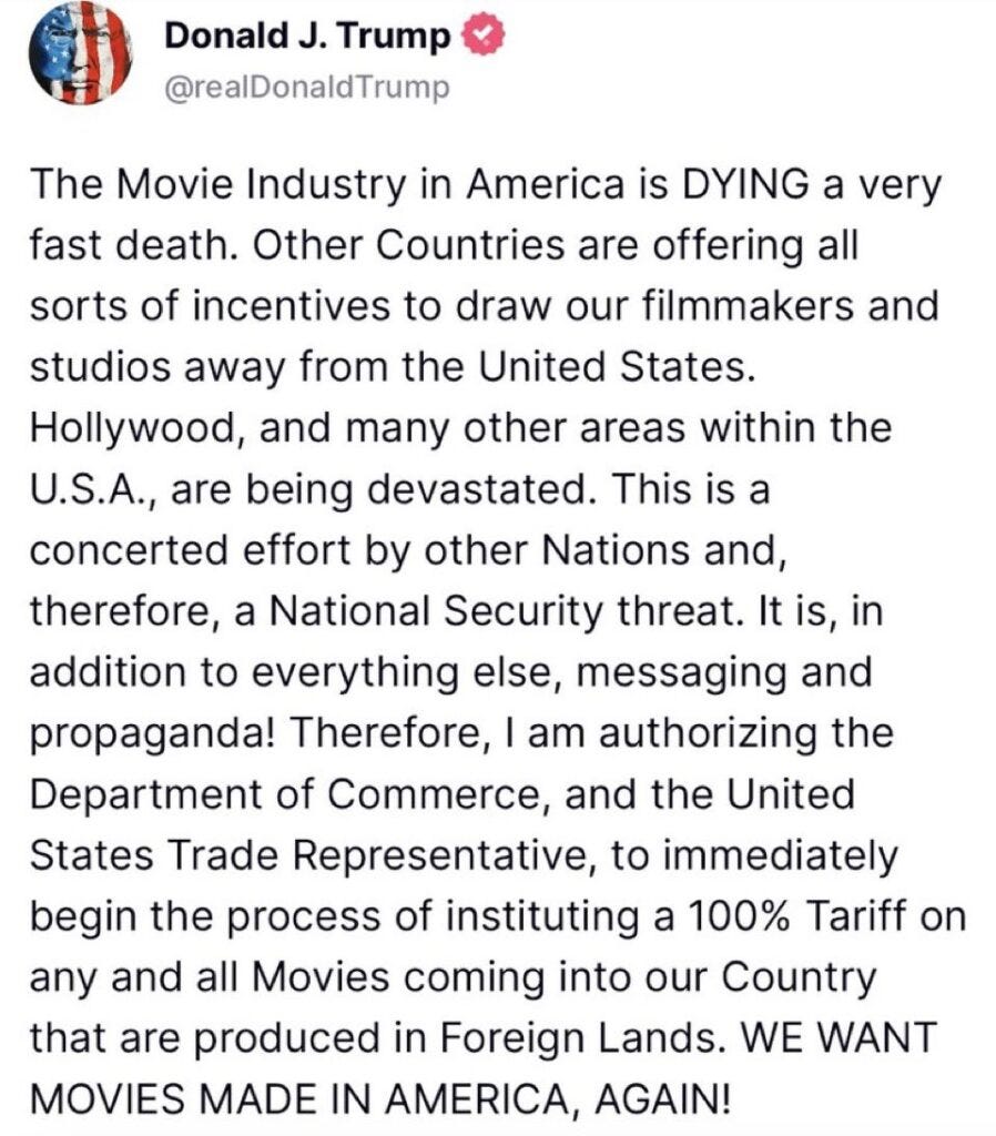 Announced in a Truth Social post, Trump said that the US Department of Commerce and Trade Representative will start the process of levying a 100% tariff on all movies that are not produced in the U.S.