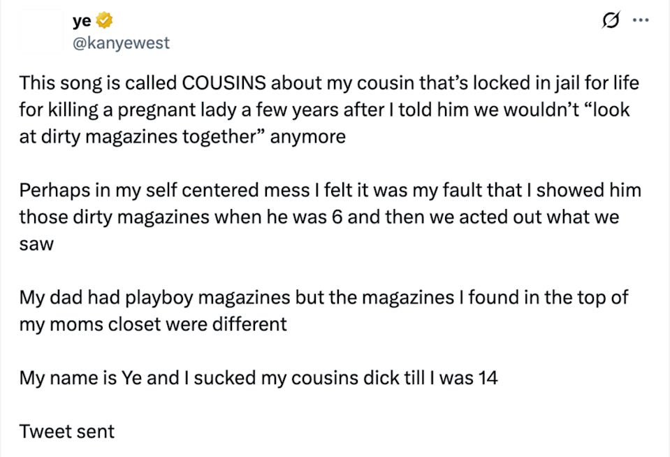 In a tweet that is still available, as of this sad Earth Day, Kanye admits to having an underage, incestual relationship with his cousin. While the revelation is indeed sad, it is the matter in which not only he writes about, but the fact that he has left it open for either further interpretation and fodder, and has made it his newest marketing tool. Now, far be it for me to tell someone that they should not make art about their trauma, but please, please, please, leave some things in the draft.