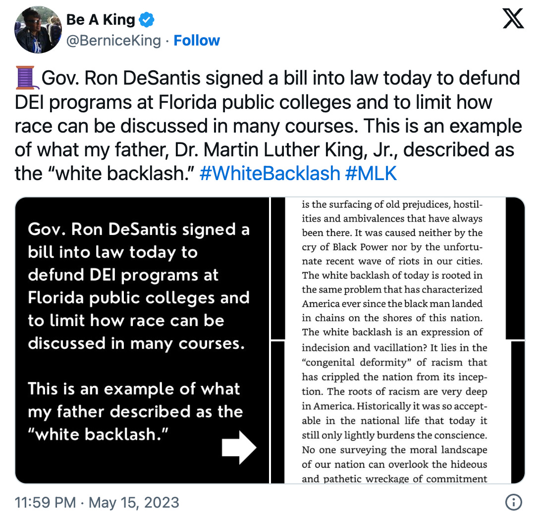 For years, Bernice King, Dr. King’s daughter, has asked racists not to quote her father to justify their white nationalist propaganda and agendas. She has called out both Ron DeSantis and Ted Cruz for their abuse of her father’s name while espousing racism, to no avail or apology.