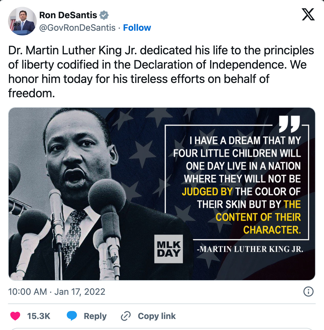 Another slimeball lawmaker, Ted Cruz, who always looks as if he’s going to fart out of his mouth and left his own constituents for dead while he hopped town to go escape the cold, quoted several of MLK’s statements about Christianity on Xitter, as well as an entire thread dedicated to the “I Have A Dream,” speech. However, the only time he mentioned Black History Month was to complain about the lack of representation on a TV ad that featured Barack Obama, Kamala Harris, and Stacy Abrams and no Black Republicans. To make a stink about a bias based on racial identity while also denying it happens is certainly illogical. But hey, so is kissing up to the man who insulted your wife. Ron DeSantis, the governor who wanted children to learn that slavery taught Blacks valuable skills, was sure to post a picture of MLK and a quote on social media with “judged by” and “the content of their character,” highlighted in a different color.