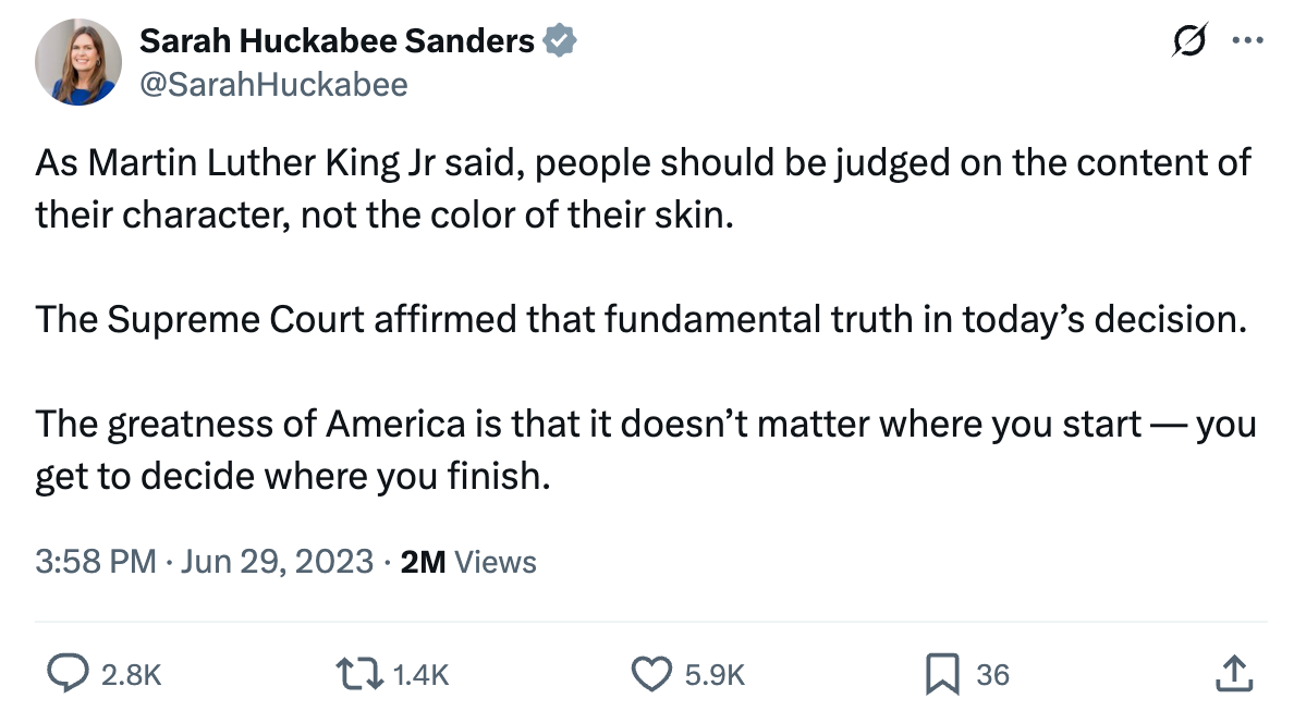 Every MLK day, without fail, Arkansas governor and underqualified nepo baby, Sarah Huckabee Sanders—a woman whose looks mirror her insides—takes an opportunity to tweet about celebrating MLK’s legacy, most often in a vague manner that does not specifically address the things he fought for, and most importantly, against. She has even gone so far as to stray outside the confines of the holiday and use his quote about being judged on the content of one’s character and not the color of one’s skin when celebrating the repeal of Affirmative Action; how dreadfully disgusting and insulting. This is not uncommon for many racists who are afraid of the title and find comfort in identifying with the parts of his teachings they can take out of context. They also ignore King’s stance on Affirmative Action, made clear in his writings years later, in the 1967 book, Where Do We Go from Here: Chaos or Community, where he states, “a society that has done something special against the Negro for hundreds of years must now do something special for the Negro.”