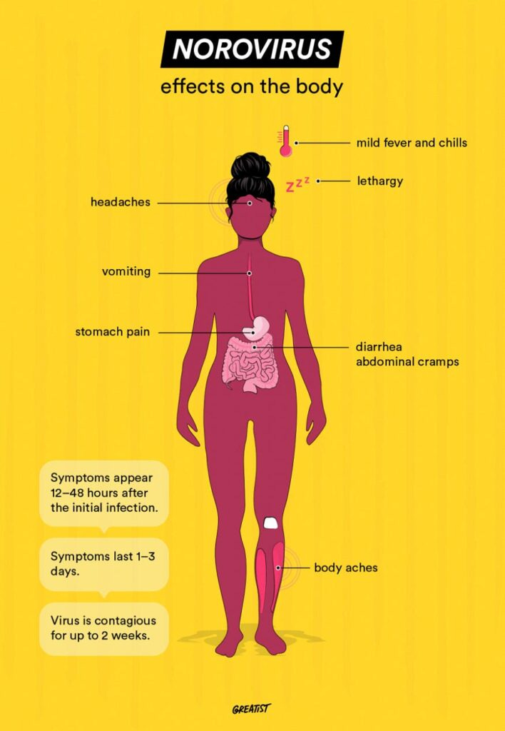 Along with diarrhea and vomiting, the virus can cause nausea, fever, headaches, body aches, dehydration and stomach pain.