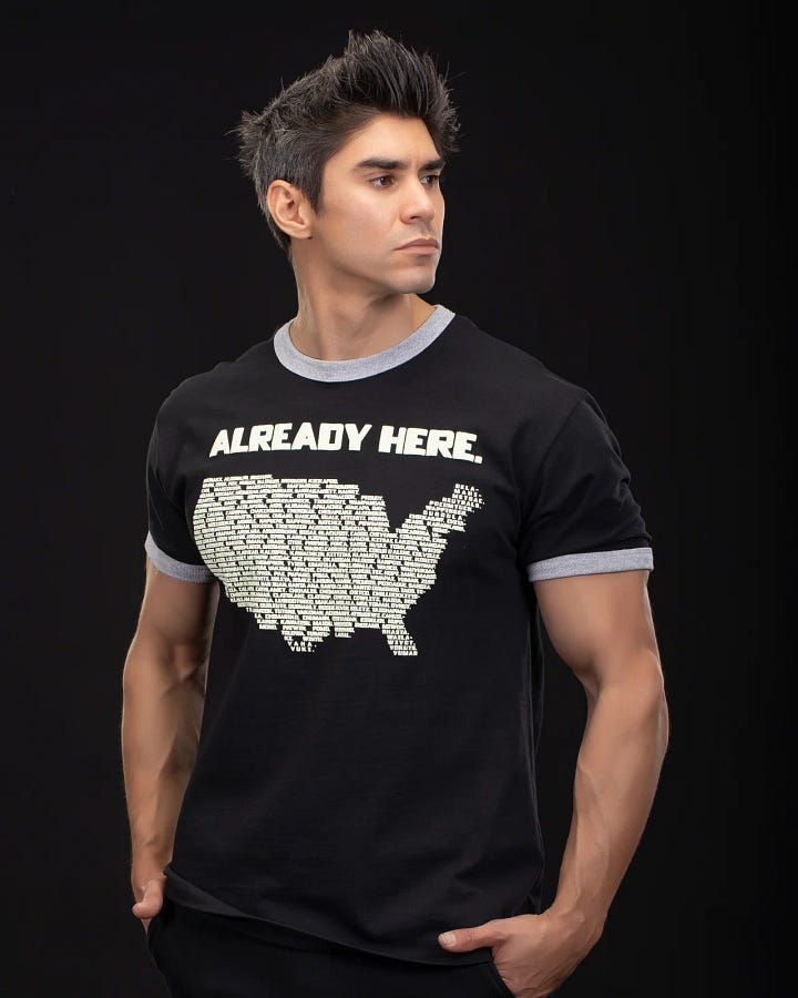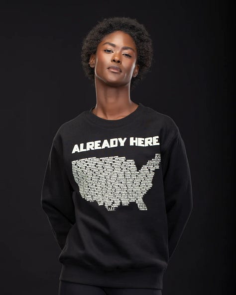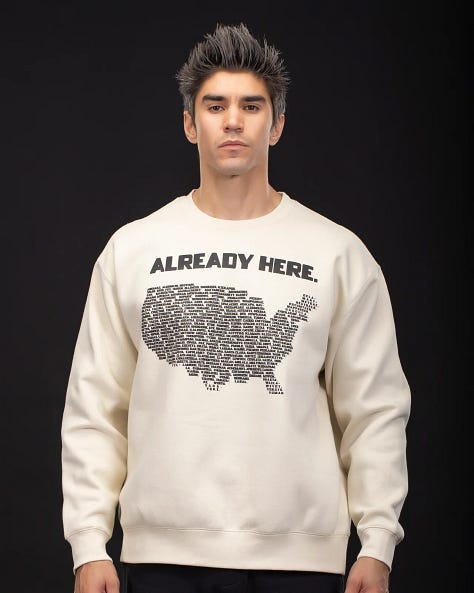Her latest clothing drop, “Already Here,” launched on The Global Majority. It drives home the message that there was no discovery of this land—the Indigenous peoples were already here.