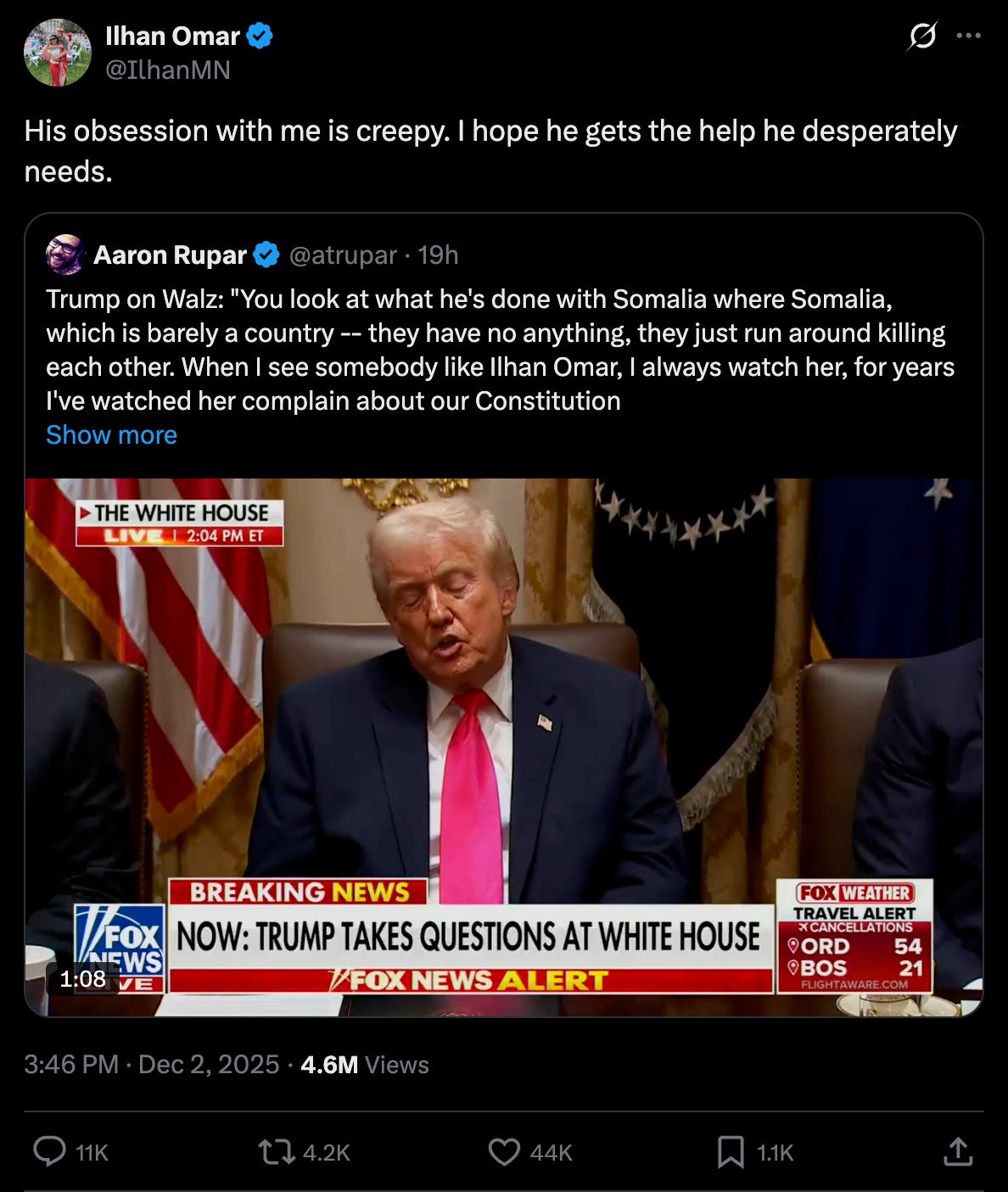 Omar responded on social media, describing Trump’s fixation as “creepy.”