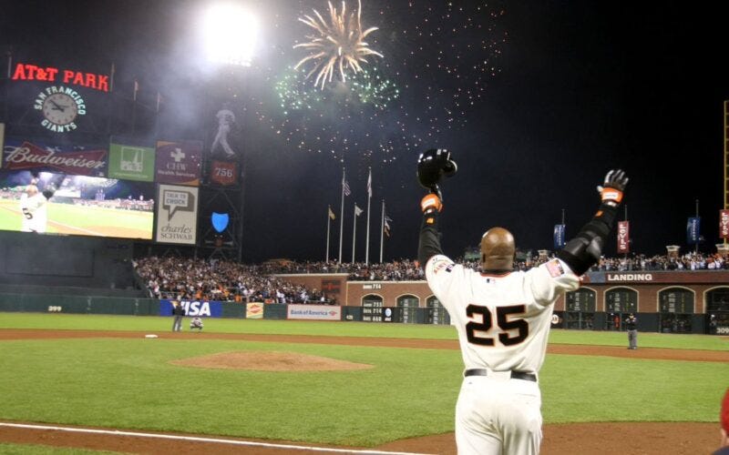 Bonds would cement his name in the record books when he sent a fastball from Washington Nationals pitcher Mike Bacsik deep into the right-center field bleachers. It was Bonds’ 755th career homer, replacing Aaron on the all-time home run list.