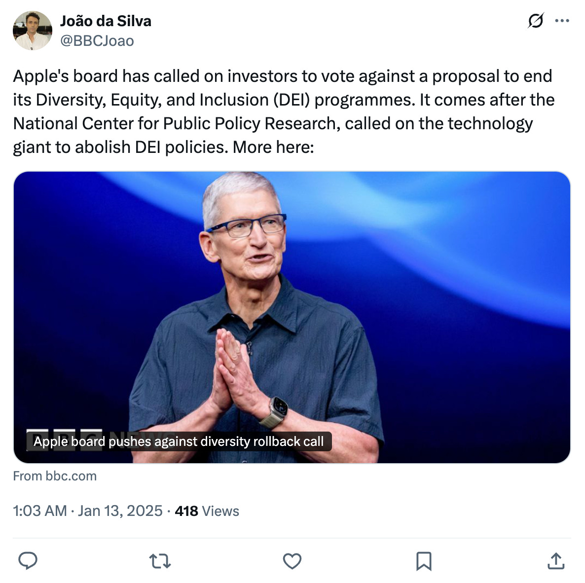 The think tank is attempting to use the Supreme Court’s latest decision to argue that it can be applied to corporate DEI programs as well. Apple has since responded by affirming that the proposal is “unnecessary” and that their DEI programs do not discriminate in hiring or promotion. The vote is scheduled to take place on Feb. 25.