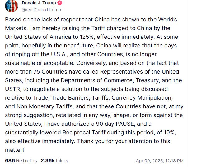 The pause was announced online in a Truth Social post alongside an announcement that tariffs on China will be raised upto 125% because of their “lack of respect.” The countries that did not retaliate were reportedly given the 90-day pause.