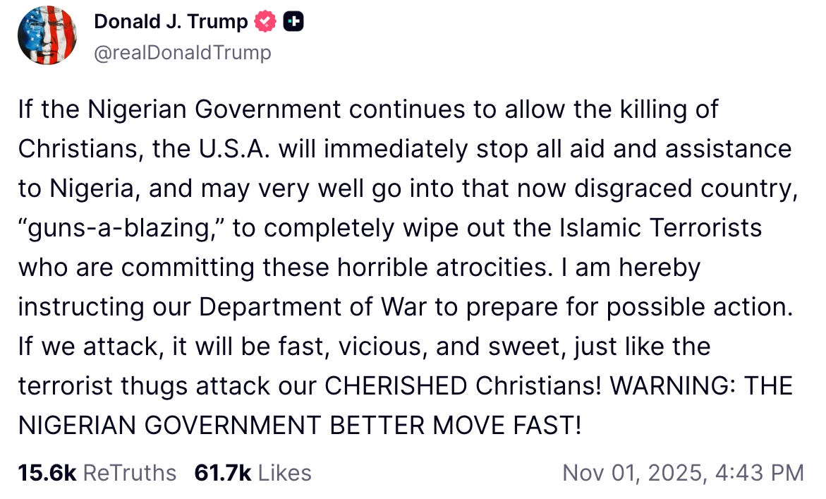 “If the Nigerian Government continues to allow the killing of Christians, the U.S.A. will immediately stop all aid and assistance to Nigeria, and may very well go into that now disgraced country, ‘guns-a-blazing,’ to completely wipe out the Islamic Terrorists who are committing these horrible atrocities,” Trump wrote on his Truth Social platform.