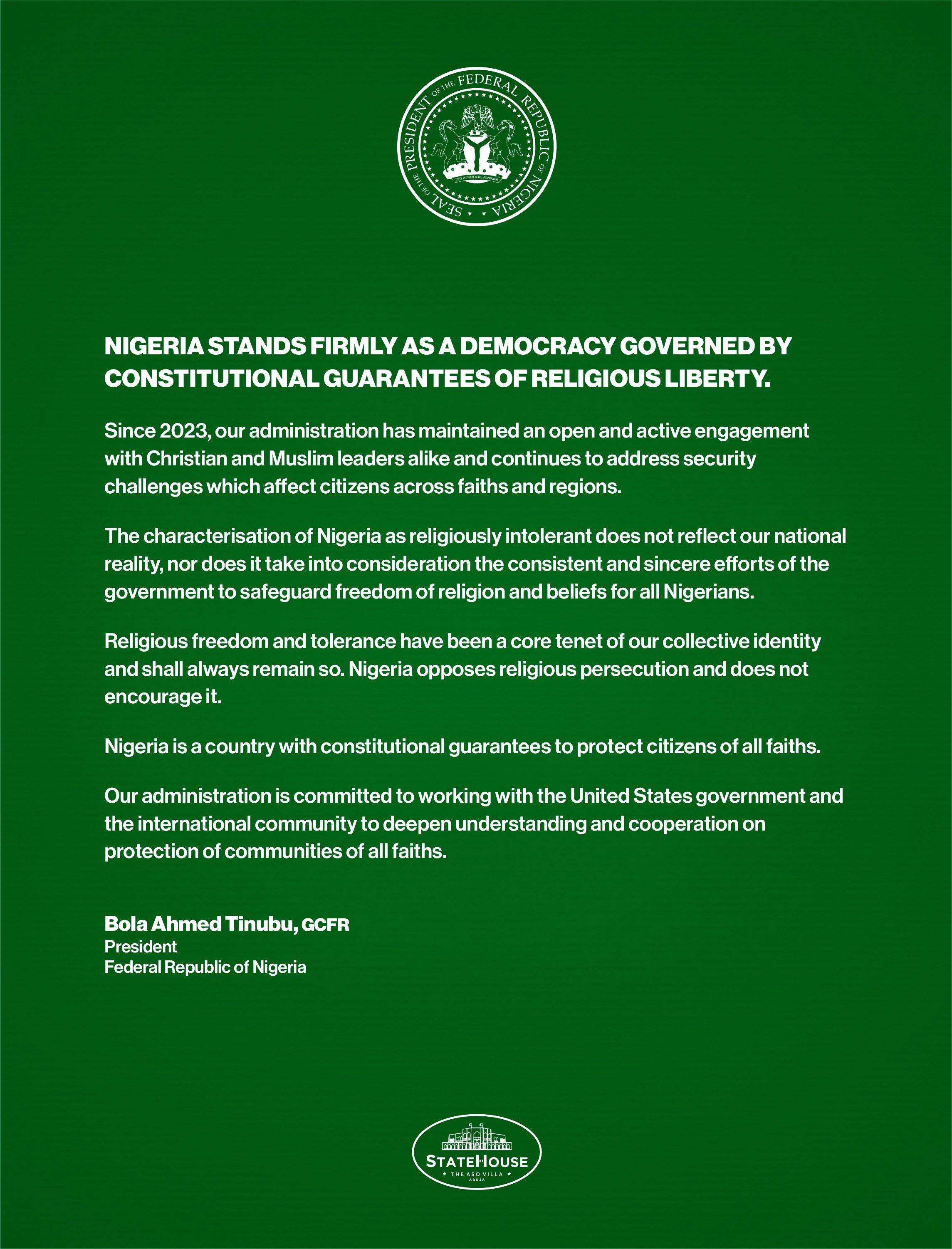 “Since 2023, our administration has maintained an open and active engagement with Christian and Muslim leaders alike and continues to address security challenges which affect citizens across faiths and regions,” Nigerian President Bola Ahmed Tinubu said on X, formerly Twitter. “The characterization of Nigeria as religiously intolerant does not reflect our national reality, nor does it take into consideration the consistent and sincere efforts of the government to safeguard freedom of religion and beliefs for all Nigerians.”