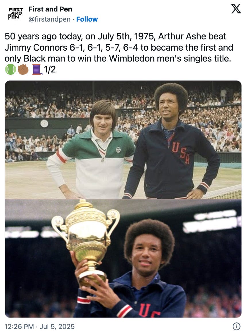 On July 5, we celebrated the 50th anniversary of Arthur Ashe beating Jimmy Connors to win the Wimbledon male single’s title, which marked the first and only time a Black man has won that title.